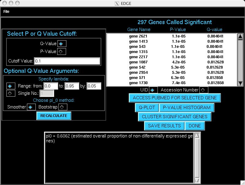 The differential expression results window. Once EDGE has finished performing the significance calculations for differentially expressed genes, it is possible to adjust the significance cut-off according to either q-values or p-values. It is also possible to observe the global behavior of these in order to choose a sensible cut-off that balances false discoveries to the number of significant genes. A singificant gene can be selected and its information looked up at NCBI according to its gene name (e.g., an accession number or UID). A hierarchical clustering of the signficant genes can be constructed.