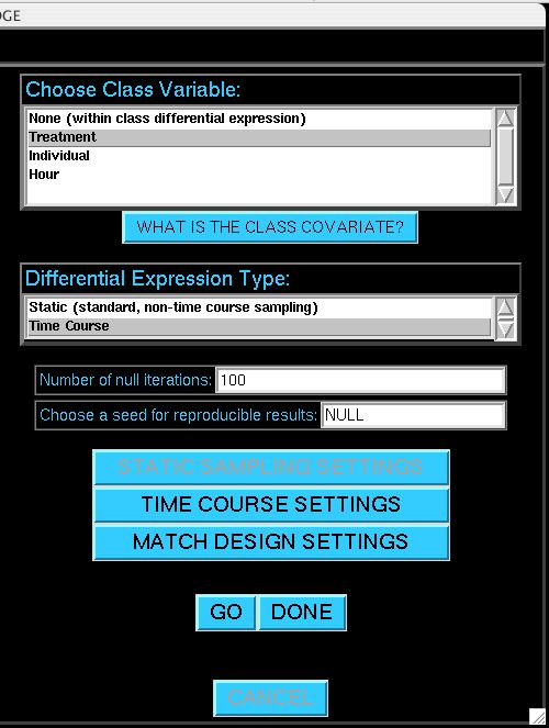 The window used to identify differentially expressed genes. The classes across which differential expression is to be discovered can be designated, along with information about the experimental design and the number of null iterations.